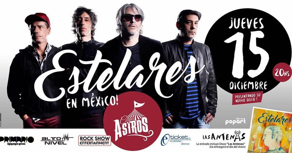 Estelares regresa a México para presentar oficialmente en gira su nuevo álbum "Las Antenas" el próximo Jueves 15 de diciembre en la Carpa Astros a partir de las ocho de la noche. Boletos a la venta en el Sistema E-Ticket, y sin cargos en taquillas de la Carpa Astros y Tienda Primario.