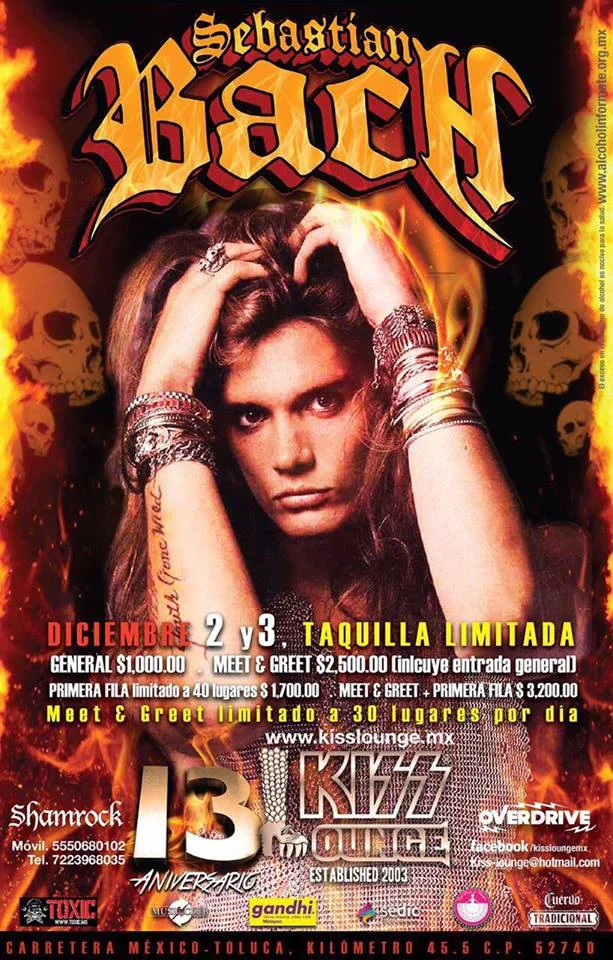 SEBASTIAN BACH vocalista de la banda SKID ROW se presentara en vivo aquí en la CDMX los días 2 y 3 de diciembre en el KISS LOUNGE un concierto que solo tendrán oportunidad de presenciar 200 verdaderos rockeros y amantes del metal, para mayores informes y venta de boletos a los tels.: 01722 396 8035 y 555068 0102, dense prisa porque están a la venta desde hace 3 días.