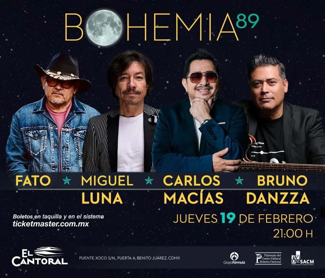 La Bohemia 89, se presentará en El Cantoral de la Ciudad de México, el próximo 19 de febrero a las 21:00 hrs., se reunirán Fato, autor de temas como Por Mujeres Como Tu, Me Vas a Extrañar, Terrenal y muchos éxitos mas.