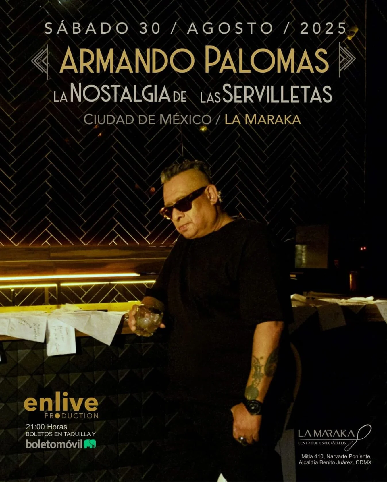 Armando Palomas, el entrañable trovador del rock urbano mexicano, regresará a los escenarios de la capital del país el próximo sábado 30 de agosto de 2025, en punto de las 21:00 horas, con una presentación especial en el Salón La Maraka de la Ciudad de México. Este concierto, organizado por la promotora EnLive, marcará el inicio de una serie de cinco presentaciones exclusivas en diferentes ciudades del país, concebidas como una despedida a su manera y en su propio ritmo, dado que, por razones personales y de salud, ha decidido no emprender más giras largas como en años anteriores. La cita en La Maraka no solo representa una oportunidad de reencontrarse con su público capitalino, sino también el estreno en vivo de su más reciente y esperado proyecto: el disco-libro "La Nostalgia de Las Servilletas". Boletos a la venta en el Sistema Boletomovil y en taquillas del inmueble.