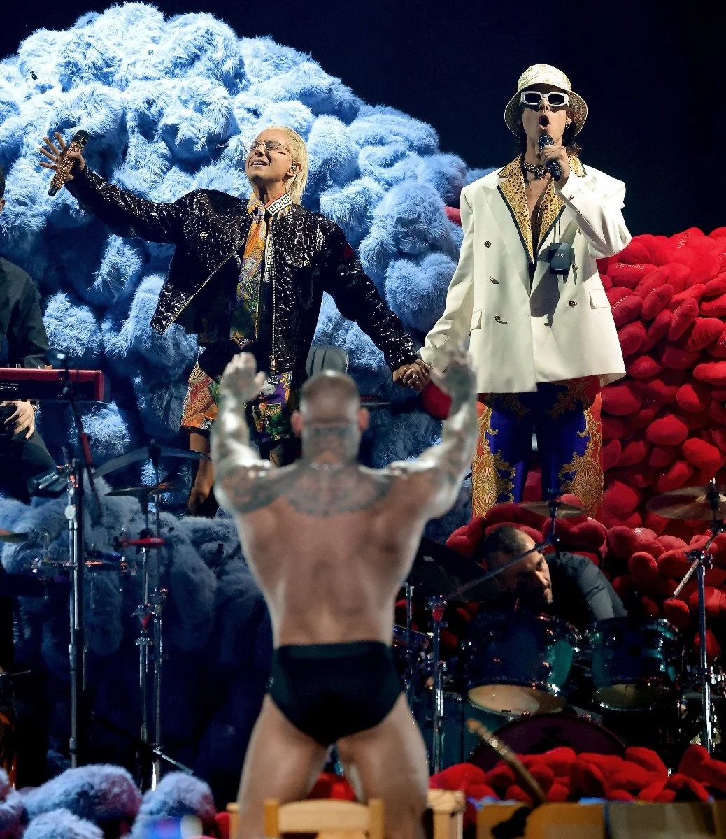 Anoche, CA7RIEL & Paco Amoroso se subieron literalmente a la cima de su propio universo en los Latin GRAMMY. En una puesta escénica tan insólita como memorable, interpretó un popurrí de éxitos desde dos montañas gigantes formados por los íconos de su sesión Tiny Desk: el sombrero azul para Paco y el chaleco de peluche con corazones rojos para CA7RIEL. Mientras sonaban “IMPOSTOR”, “LA QUE PUEDE, PUEDE” y sus dos nominadas a “Canción del Año” —“#TETAS” y “EL DÍA DEL AMIGO” —, una fila de musculosos chads cosía más piezas de los vestuarios a toda velocidad, sumándolas al paisaje en tiempo real. Entre la ironía y la celebración del fenómeno viral desatado a partir de Tiny Desk, la dupla convirtió su número en una escena de culto, de esas que quedan en la historia de los Latin GRAMMY.