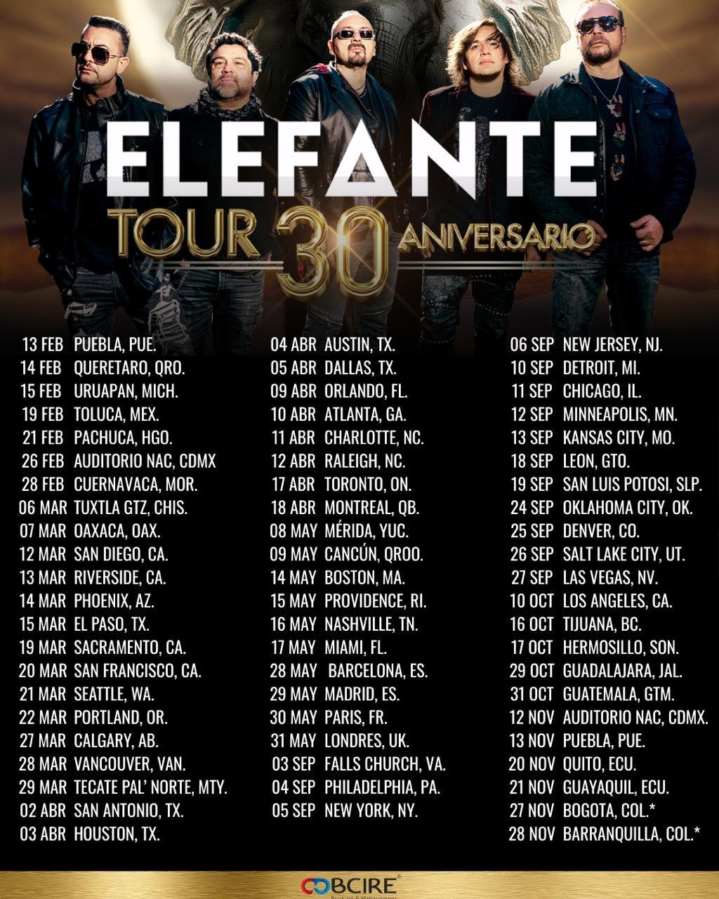“Elefante Tour 30 Años” representa una de las giras nacionales e internacionales más prometedoras de la carrera del grupo, con un extenso repertorio y actuaciones renovadas. El espectáculo visitará más de 30 ciudades de Estados Unidos, incluyendo San Diego, Nueva York, Miami, Chicago, Atlanta, Las Vegas y Los Ángeles, entre otras. La información sobre entradas para la gira estadounidense ya está disponible en este enlace .