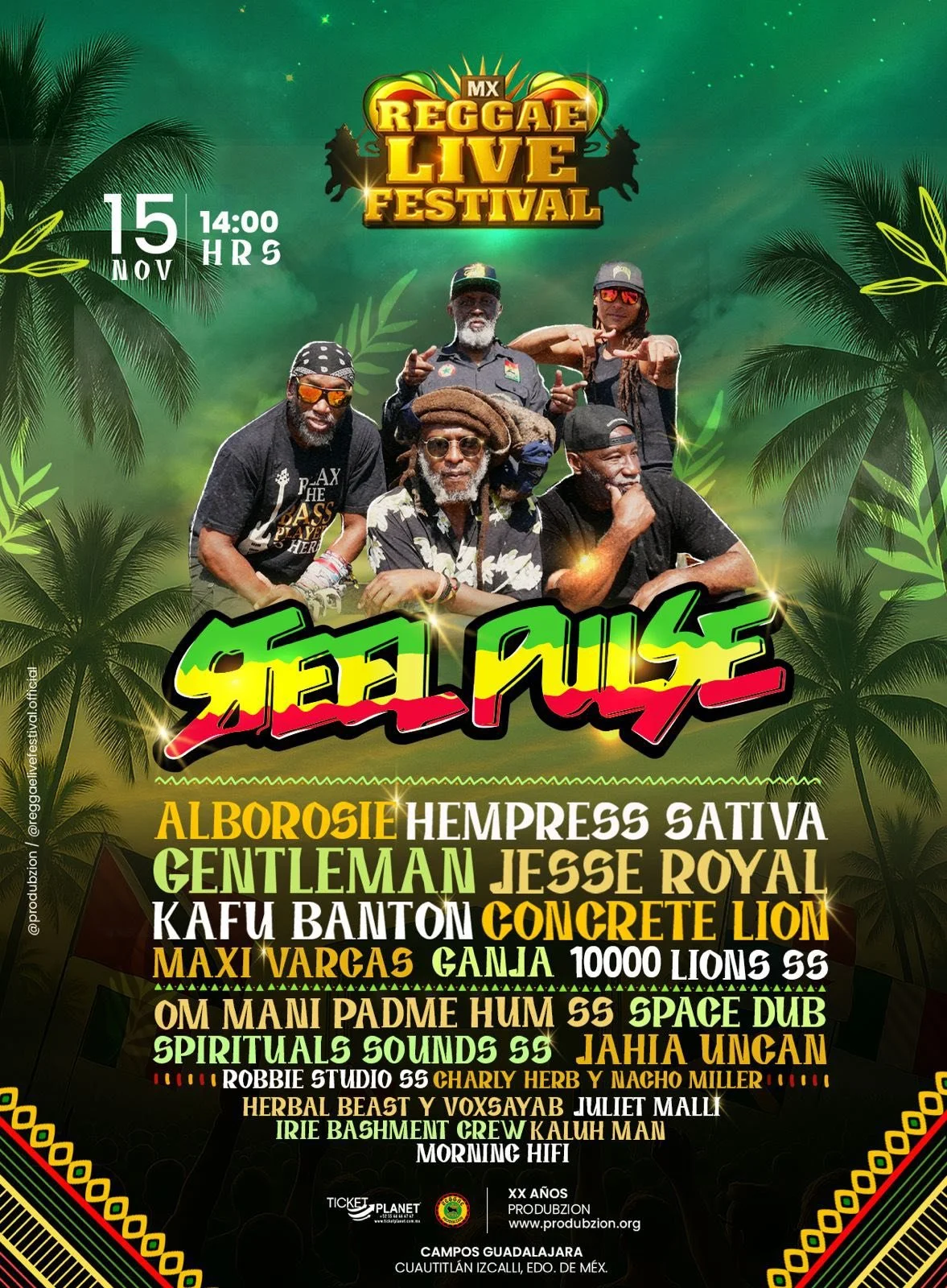 Produbzion México, referente en la escena reggae del país, celebra este 2025 sus 20 años de trayectoria con la novena edición del Reggae Live Festival, que se llevará a cabo el próximo 15 de noviembre en Campos Guadalajara, Cuautitlán Izcalli, Estado de México, con tan esperada actuación de la banda británica legendaria: STEEL PULSE después de 20 años pisa tierra azteca, celebrando 50 años de trayectoria con banda completa.