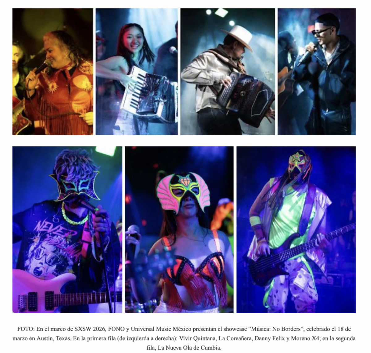 La noche de clausura de South by Southwest® (SXSW) se convirtió en una celebración inolvidable de la música mexicana cuando FONO y Universal Music México unieron fuerzas para presentar el showcase MÚSICA: NO BORDERS en Mala Fama. El electrizante evento contó con destacadas presentaciones de Vivir Quintana, La Coreañera, Danny Felix, La Nueva Ola de Cumbia y Moreno X4, destacando a una nueva generación de artistas que está redefiniendo el sonido del regional mexicano mientras lleva el género hacia nuevos horizontes.