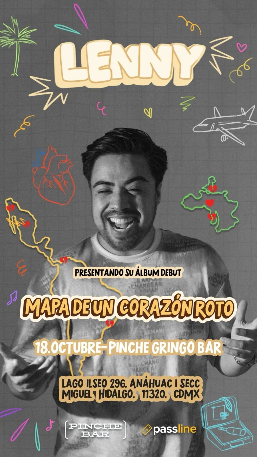 El rock mexicano se llena de nuevas emociones y horizontes sonoros con el lanzamiento de “Mapa de un corazón roto” , el álbum debut de Lenny , cantante y compositor mexicano que ha decidido trazar con música la cartografía emocional de una ruptura amorosa. Este material será presentado oficialmente el 18 de octubre en el Pinche Gringo Polanco , ubicado en Lago Iseo 296, colonia Anáhuac 1ª Sección, alcaldía Miguel Hidalgo , en un concierto íntimo que promete ser una experiencia sensorial y emocional completa. El evento dará inicio a las 7 de la noche , con boletos disponibles a través de Passline y una atractiva promoción 2x1 , un gesto del artista hacia su público para celebrar este momento tan esperado.